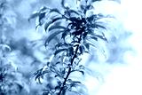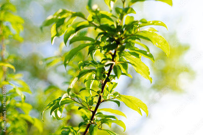 Plum tree branch with young fruit, green leaves foliage and defocused bokeh background in early morning light