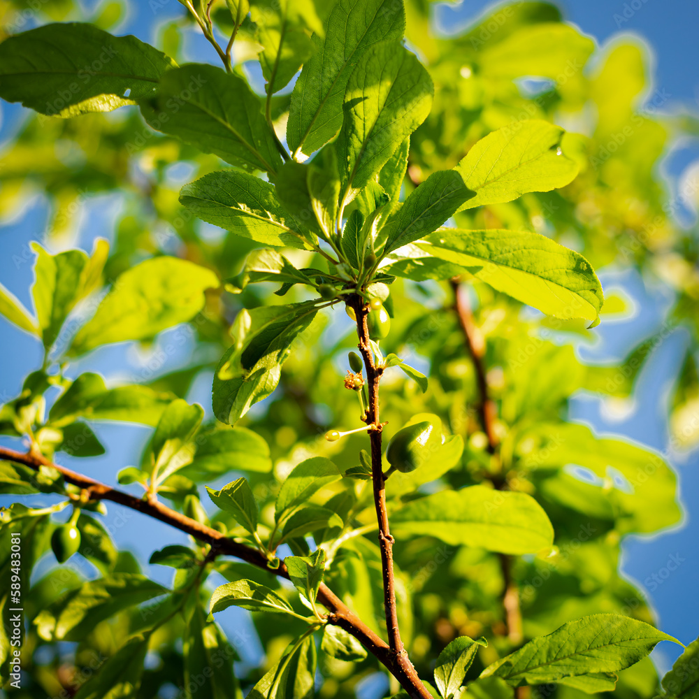 Lookup view small branch of plum tree with young fruits, green leaves foliage under clear blue sky early morning light