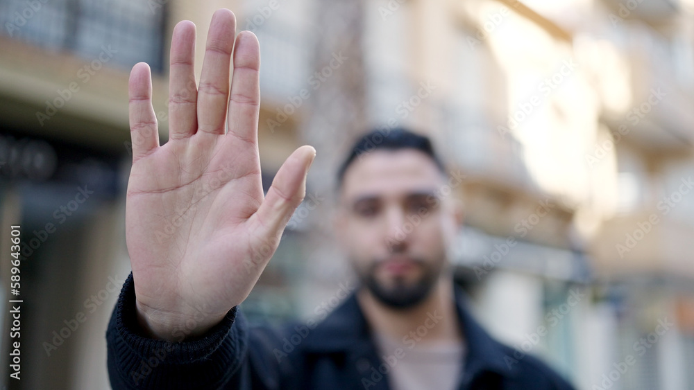 Young arab man doing stop gesture with hand at street