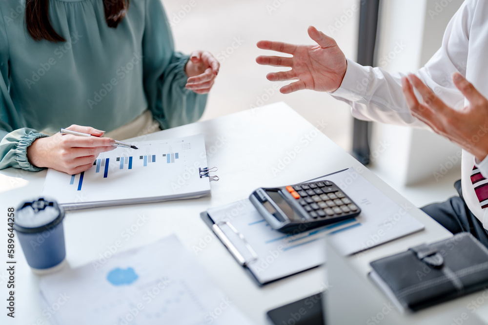 Business startup cooperation brainstorming on data documents in modern creative office..
