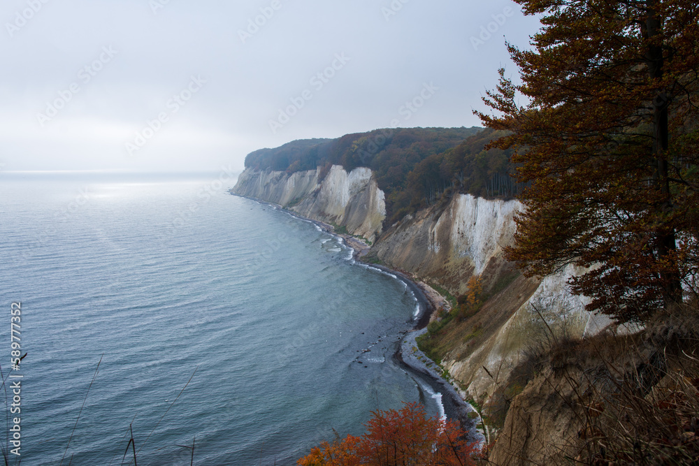panoramic image of the chalk cliffs of Rügen, Germany with heavy clouds and sunny spots on the Baltic Sea
