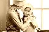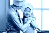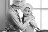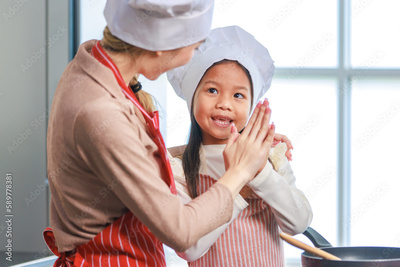 Asian young little cute girl chef daughter wears white tall cook hat and apron standing smiling posing together with mother while cooking food with pan in home kitchen.