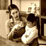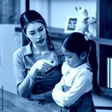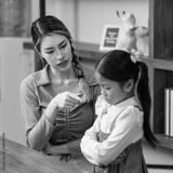 Asian young angry aggressive female mother holding finger pointing teaching complaining shouting to little sad upset unhappy girl kid daughter standing crossed arms listening in living room at home