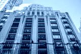 colorful new york manhattan skyscrapers view from the street to the top of the building on sunny clear day