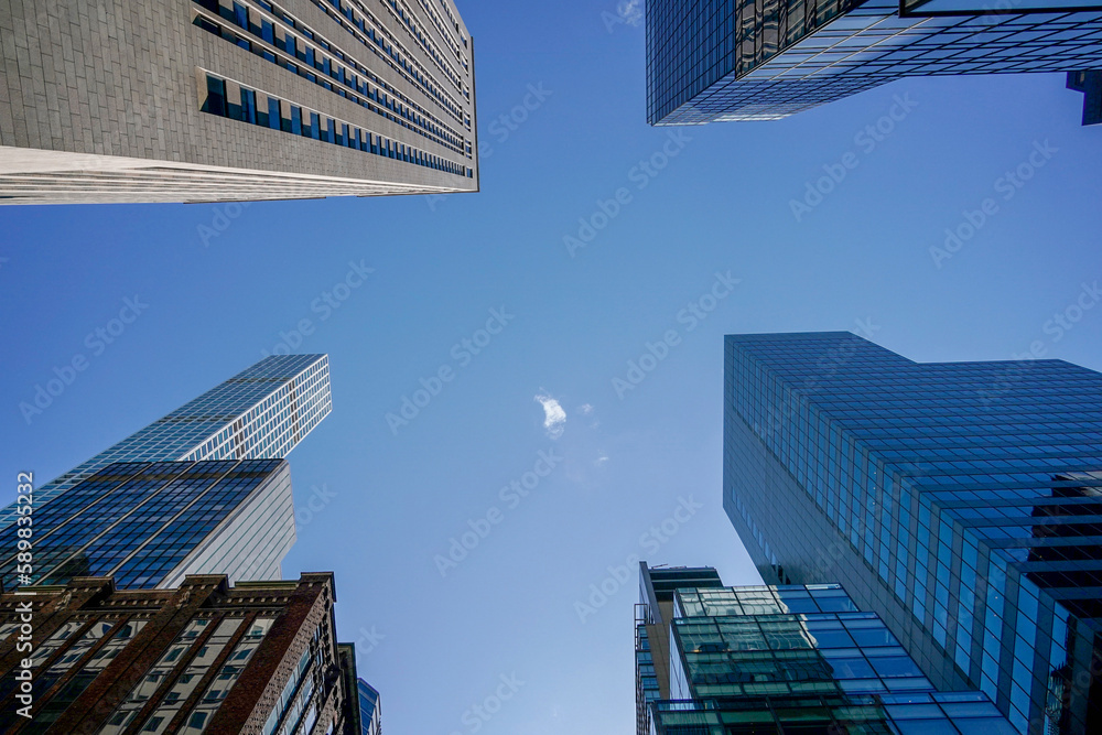 new york manhattan skyscrapers view from the street to the top of the building on sunny clear day
