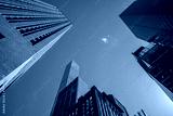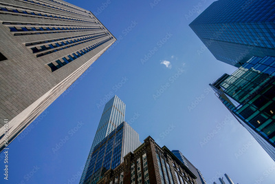 new york manhattan skyscrapers view from the street to the top of the building on sunny clear day