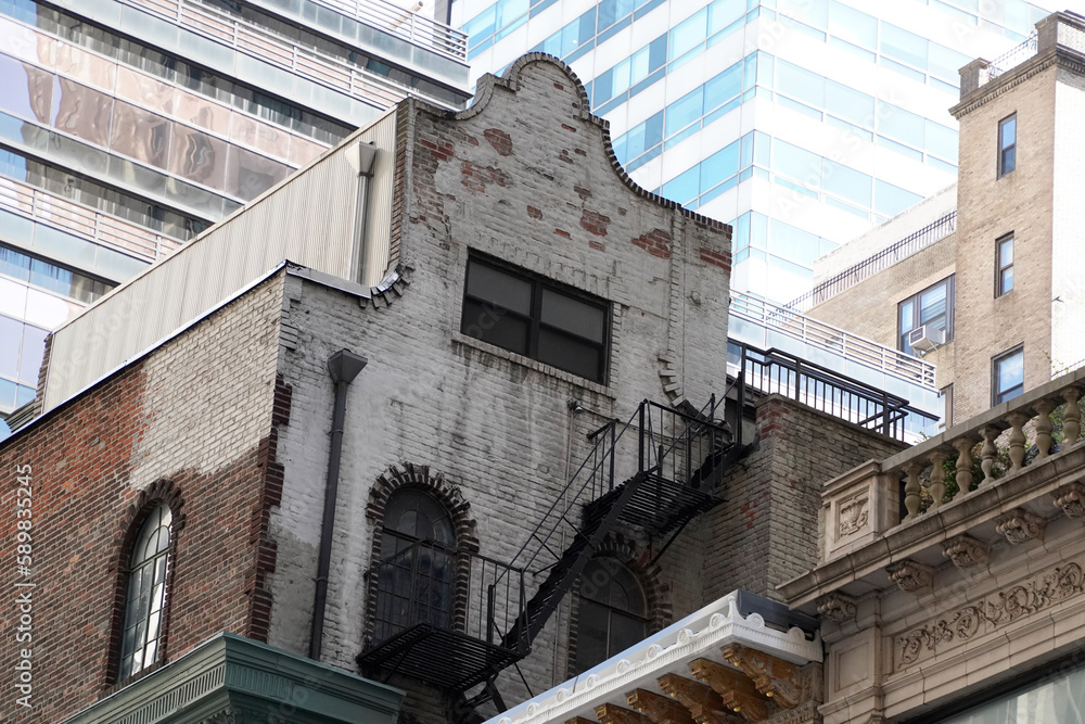 new york manhattan skyscrapers view from the street to the top of the building on sunny clear day