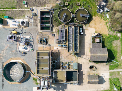 Aerial view of a newly extended sewage treatment works showing the stage collection ponds together with the water purification systems.