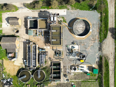Aerial view of a newly extended sewage treatment works showing the stage collection ponds together with the water purification systems.
