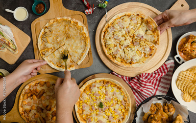 Top view shot of various kinds of delicious tasty juicy cheesy pizza placed on wooden board on party table around with other fast food while unrecognizable people picking up eating dinner together