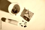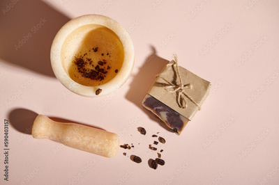 View from above of ground coffee beans in a beige marble mortar near pestle and homemade soap wrapped in eco paper, isolated on pink pastel background. Natural organic cosmetics for body and skin care