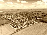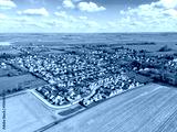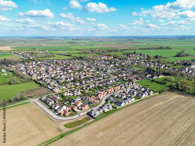 Drone view of a new housing estate showing detached bungalows in a rural location in Cambridgeshire, UK.