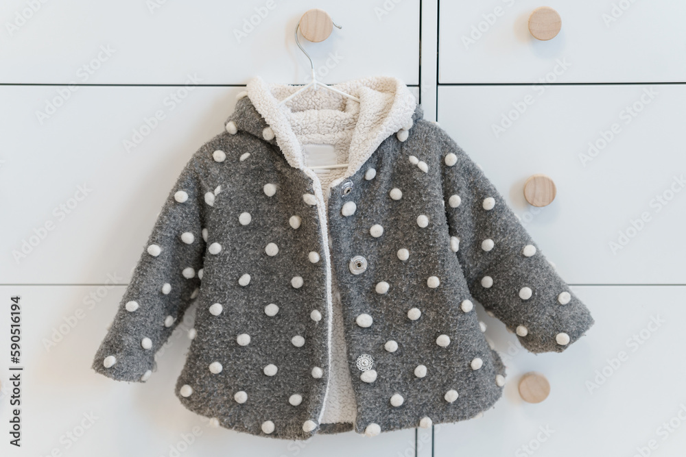 Children's warm coat on a hanger on a white closet