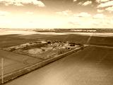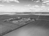 Aerial view of the flat Cambridgeshire landscape together with a sewage treatment works at a cross roads.