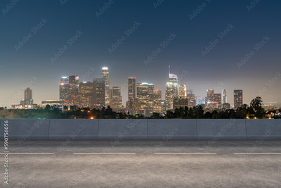 Empty urban asphalt road exterior with city buildings background. New modern highway concrete construction. Concept of way to success. Transportation logistic industry fast delivery. Los Angeles. USA.