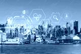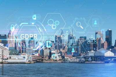 New York City skyline from New Jersey over the Hudson River towards Midtown Manhattan at day time. GDPR hologram, concept of data protection, regulation and privacy for all individuals