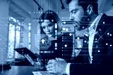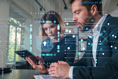 Businesspeople working together at office workplace. Concept of team work, business education, internet surfing, brainstorm, project information technology. Lock data security hologram