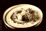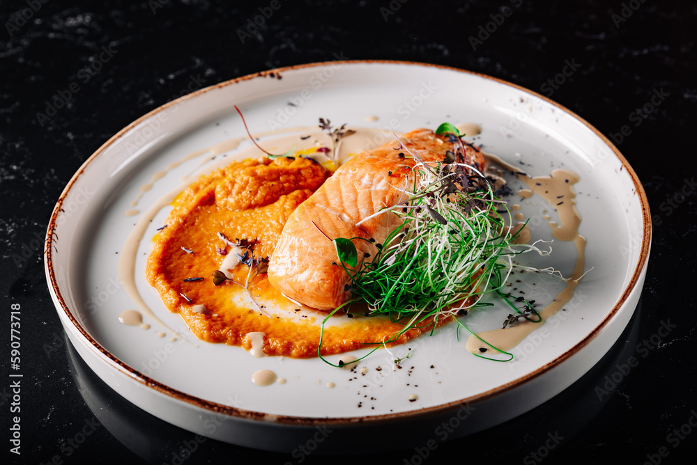 Roasted salmon steak with pumpkin cream on plate