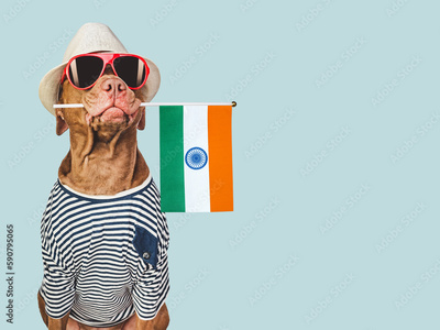 Charming, sweet brown dog, sun hat and Indian Flag. Travel preparation and planning. Close-up, indoors. Studio shot, isolated background. Vacation, travel and tourism concept. Pet care