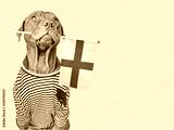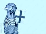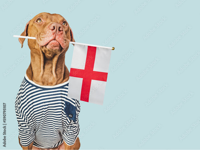 Lovable, pretty dog and Flag of England. Closeup, indoors. Studio photo. Congratulations for family, loved ones, relatives, friends and colleagues. Pet care concept
