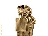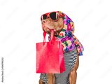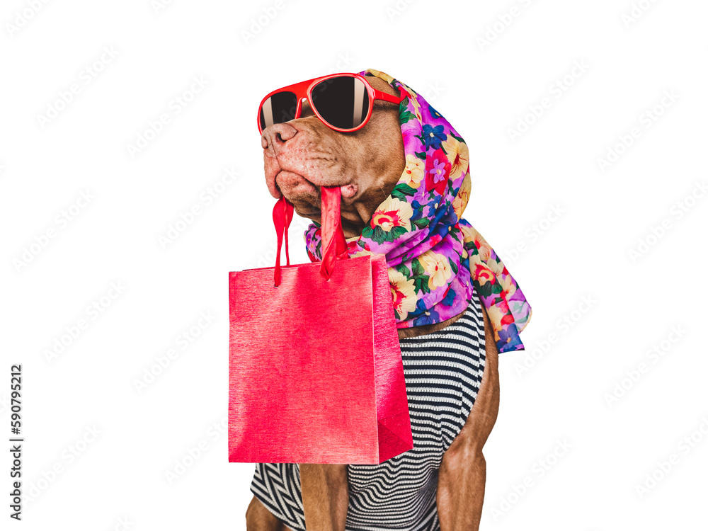 Cute puppy and shopping bag. Sales preparation. Closeup, indoors. Day light, studio photo. Isolated background. Concept of care, education and raising pet