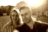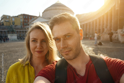 Couple of tourists taking selfie on Piazza del Plebiscito.