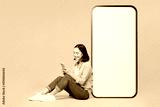 Full body fun young woman of Asian ethnicity wear yellow shirt white t-shirt sit near big huge blank screen mobile cell phone with area use smartphone isolated on plain pastel light pink background.