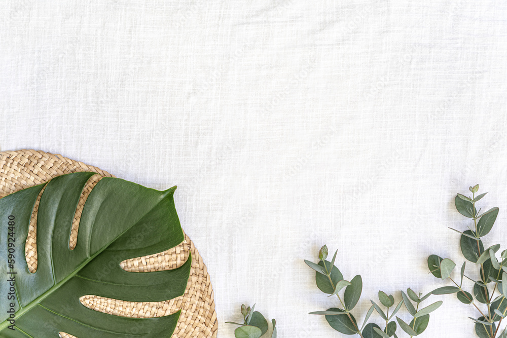 Top view tropical leaves on vibrant background. Summer flat lay composition.
