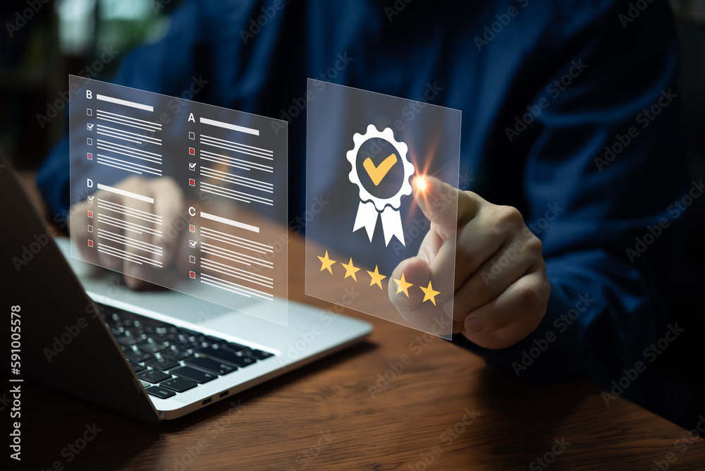 Customer or client review best and excellent service quality feedback. Internet online survey, good evaluation rating and ranking five star.