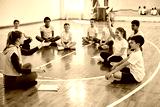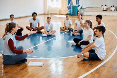 Happy girl raising her arm to answer teacher's question during physical education class at school.