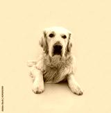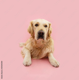 Portrait cute golden retriever dog lying down and looking at camera. Isolated on pink pastel background