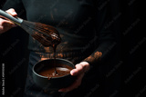 Black bowl with dark hot chocolate in hands. Kitchen utensils. On a black background.