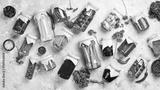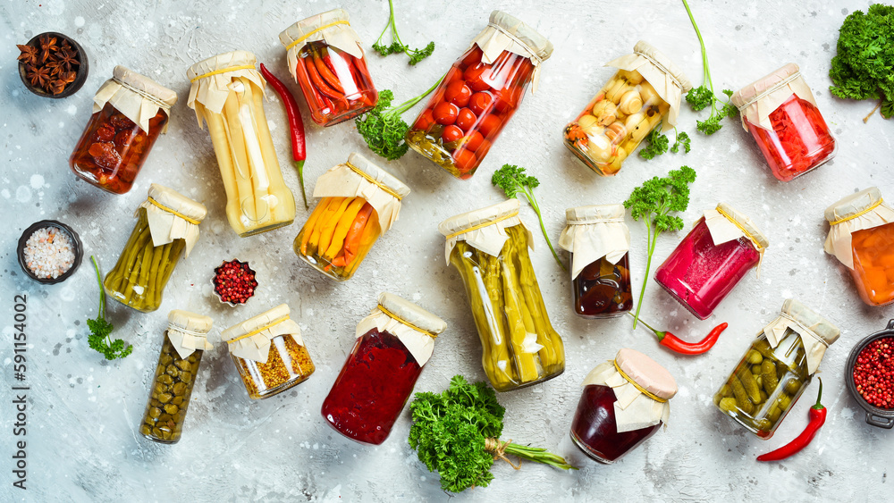 Jars with different vegetables on a stone background. Marinated vegetables. Food stocks in case of crisis. On a stone background. Top view.