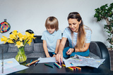 Mother and son drawing with color pencils and markers in the living room. Smiling mother has fun playing paint on paper with son on home family weekend, children creativity concept. Selective focus.