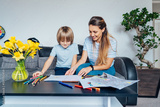Mother and son drawing with color pencils and markers in the living room. Smiling mother has fun playing paint on paper with son on home family weekend, children creativity concept. Selective focus