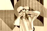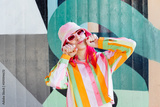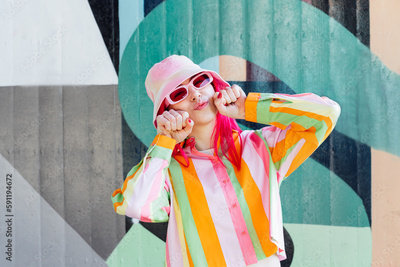 Urban Fresh street fashion look. Vanilla Girl. Kawaii vibes. Candy colors design. Bucket hat trends. Young woman with pink hair and sun glasses in multicolor strippled shirt on the wall background.