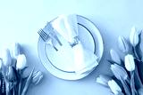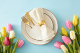 Table setting decoration concept. Top view photo of plate cutlery knife fork napkin with gold ring and bouquets of flowers yellow pink tulips on pastel blue background