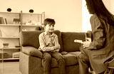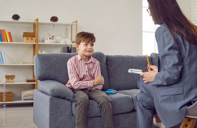 Child talking to a psychologist. Therapist communicating with a little kid. Happy, shy little boy sitting on the sofa with his toy car, looking at the woman psychologist and listening to her questions