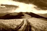 Rural road and beautyful raining dramatic sky. Amazing scene in summer mountains. Lush green grassy meadows in fantastic evening sunlight. Landscape photography