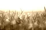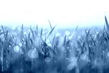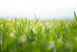 Young sprouts of wheat green leaves with dew drops on a sunny blurred background. Nature backgrounds