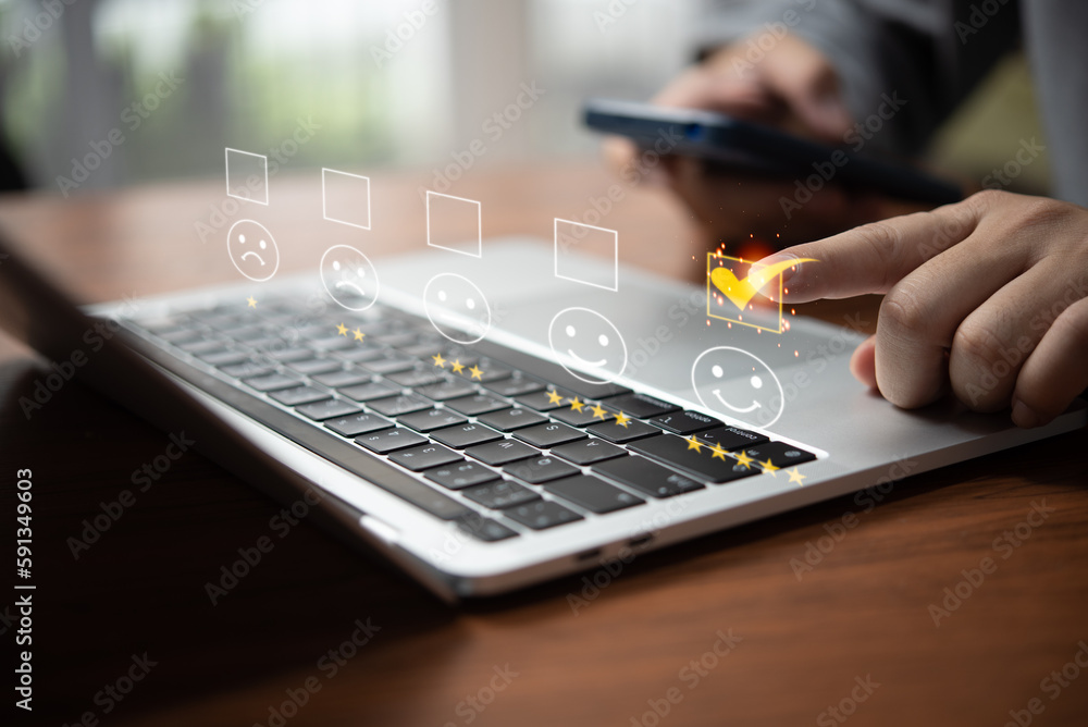 Five Star Customer Service Concept for Satisfaction.Businessman holding mobile smartphone for quality feedback related projects, marketing materials, and branding