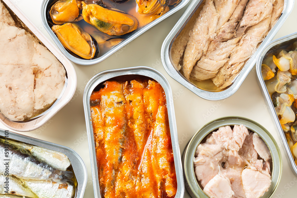 Assortment of Tinned fish, canned food ready for date night