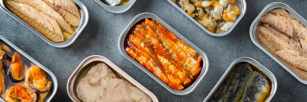 Assortment of Tinned fish, canned food ready for date night