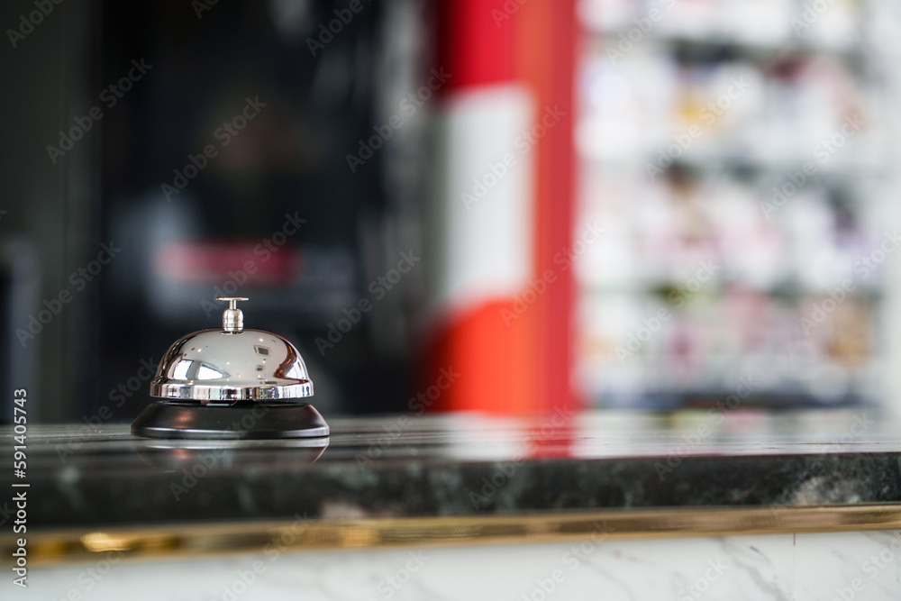 Luxury Hotel Reception Counter desk with Silver Service bell, Сheck in hotel.