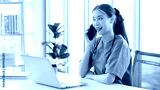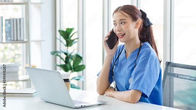 Asian young beautiful professional successful female doctor in blue uniform with stethoscope sitting smiling taking coffee break on call with smartphone in hospital office browsing laptop computer