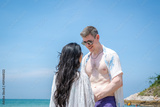 Happy young beautiful couple man and woman on the beach,Fun,Holiday.