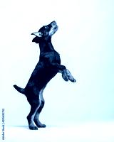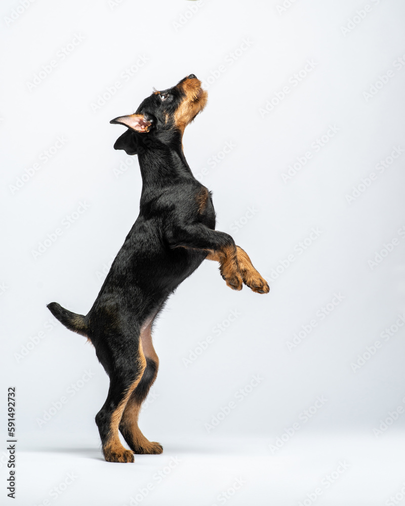 Jagdterrier puppy stood up on its hind legs. Portrait of puppy in the studio on white background. Pet jumping up