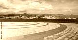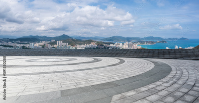 Empty floors and city skyline with buildings by the sea in sanya, Hainan, China.
