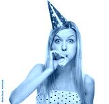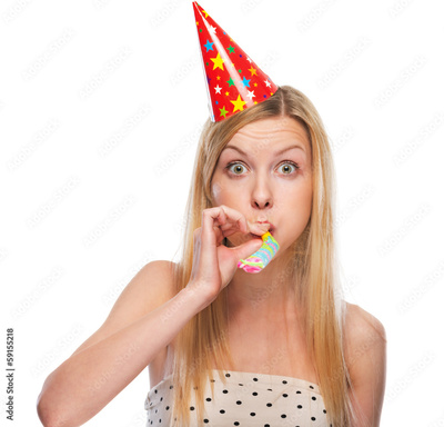 Portrait of teenage girl in cap blowing in party horn blower