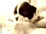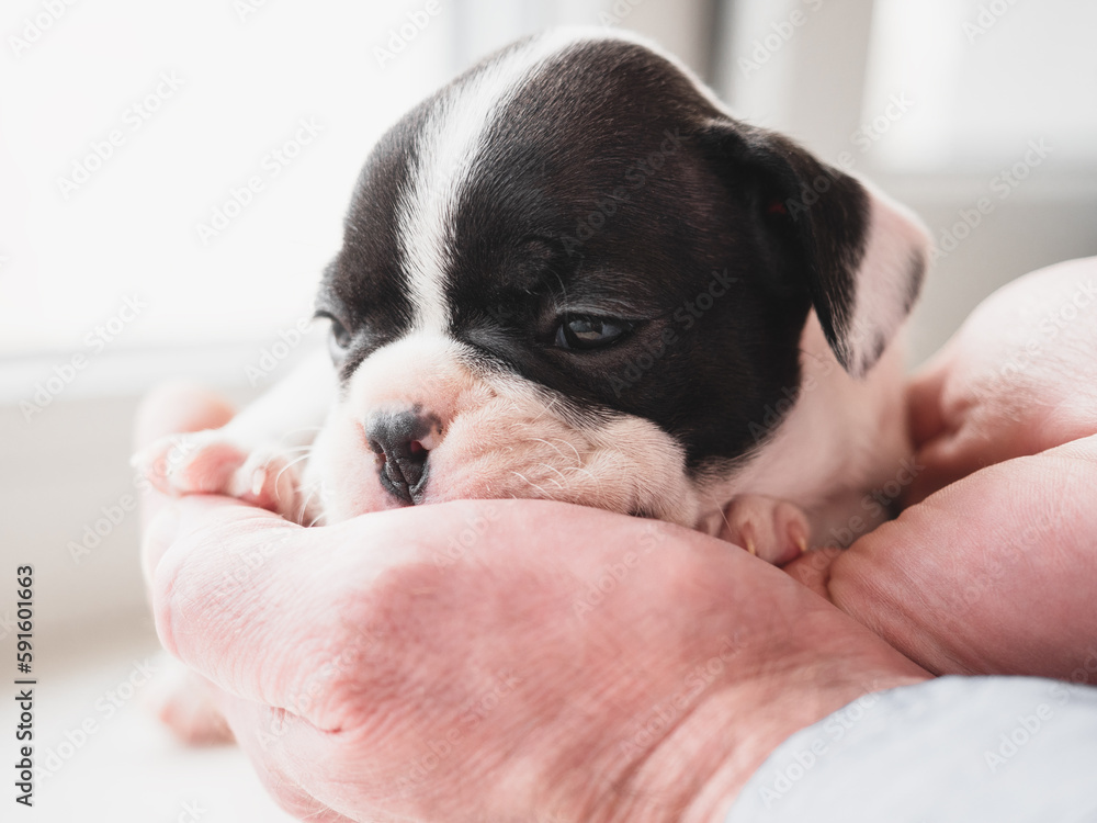 Lovable, pretty puppy and male hands. Clear, sunny day. Close-up, indoors. Studio photo. Day light. Concept of care, education, obedience training and raising pets